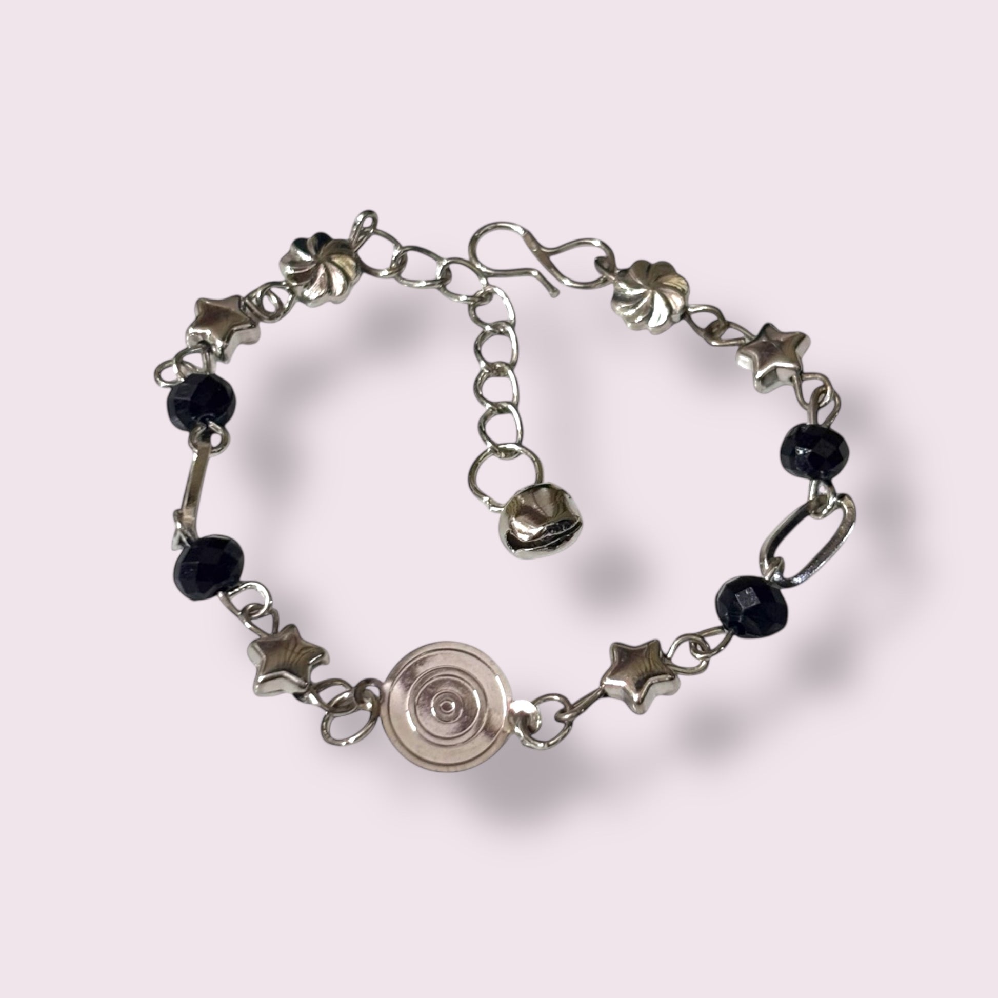 This stylish silver-tone link bracelet features a fun and eclectic mix of charms. It includes shiny black crystal beads, delicate star charms, and detailed fluted flower spacers. The adjustable chain and lobster clasp ensure a comfortable fit. A great piece for adding a subtle celestial or gothic-chic touch to your wrist stack.