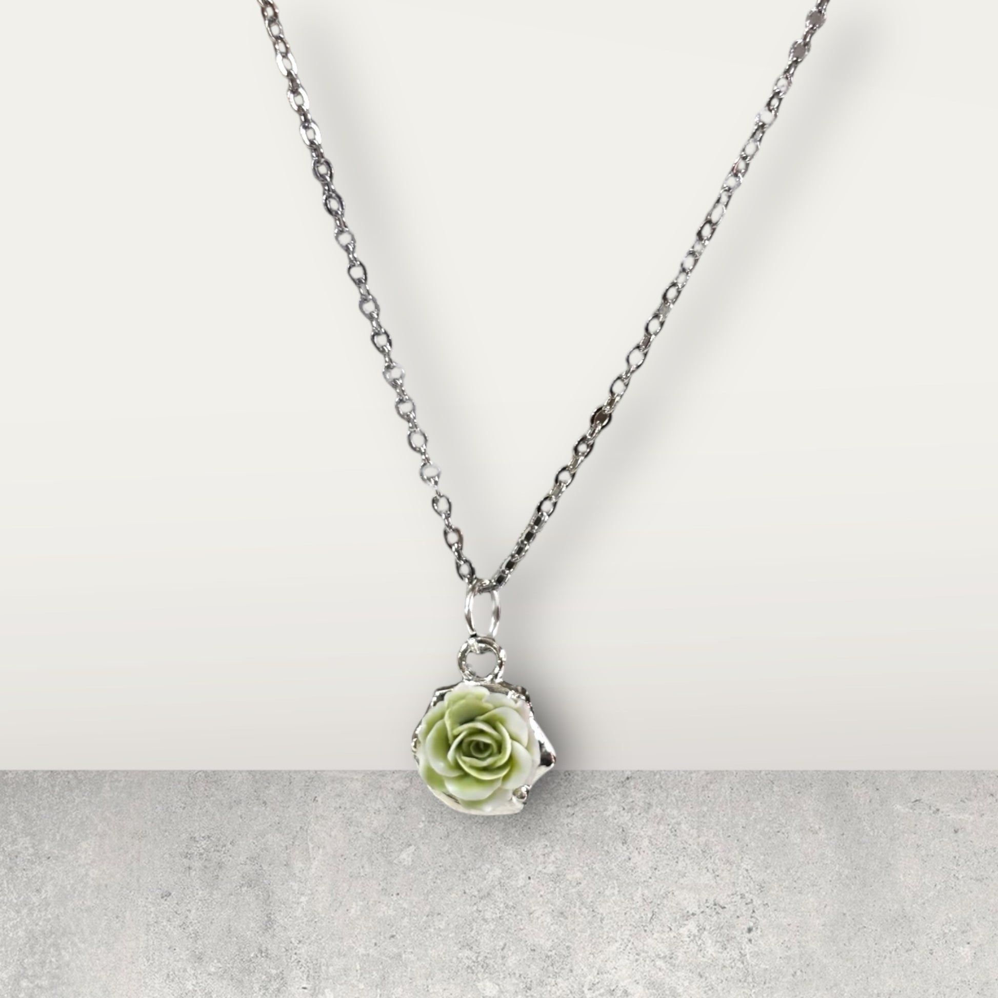 Bring a subtle touch of nature to your look with this charming Green Flower Pendant Necklace. The tiny charm resembles a delicate succulent or pastel green rose, set in a scalloped silver-tone frame. An ideal piece for those who love botanical jewelry and a light, minimalist style.