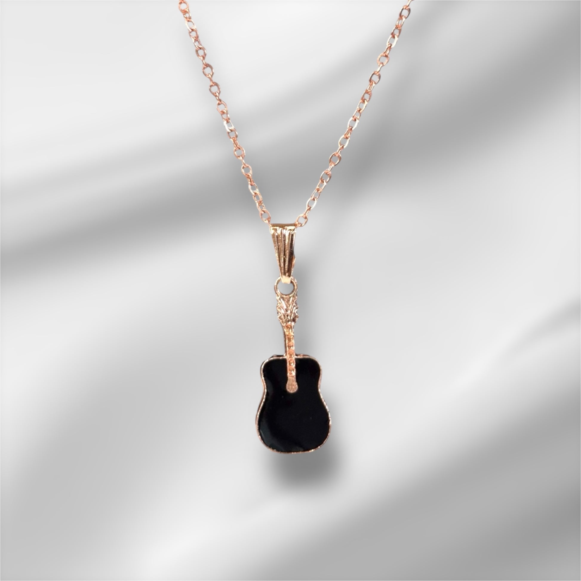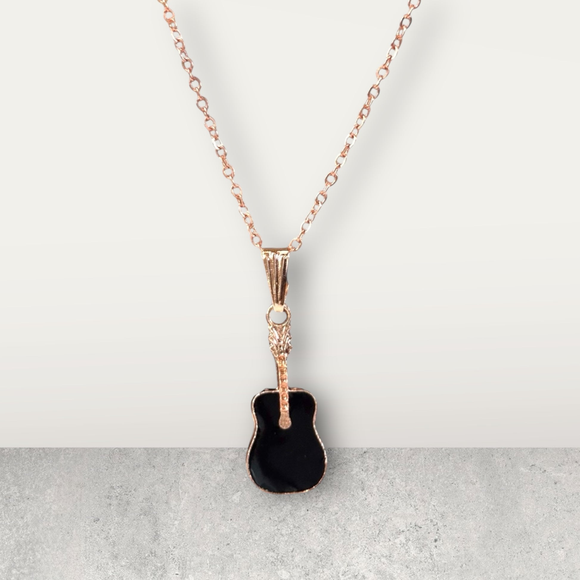 Show off your passion for music with this stylish Guitar Pendant Necklace. The body features smooth, contrasting black enamel set in a delicate rose gold-plated frame and chain. It's a perfect, subtle accessory for musicians and music fans alike.