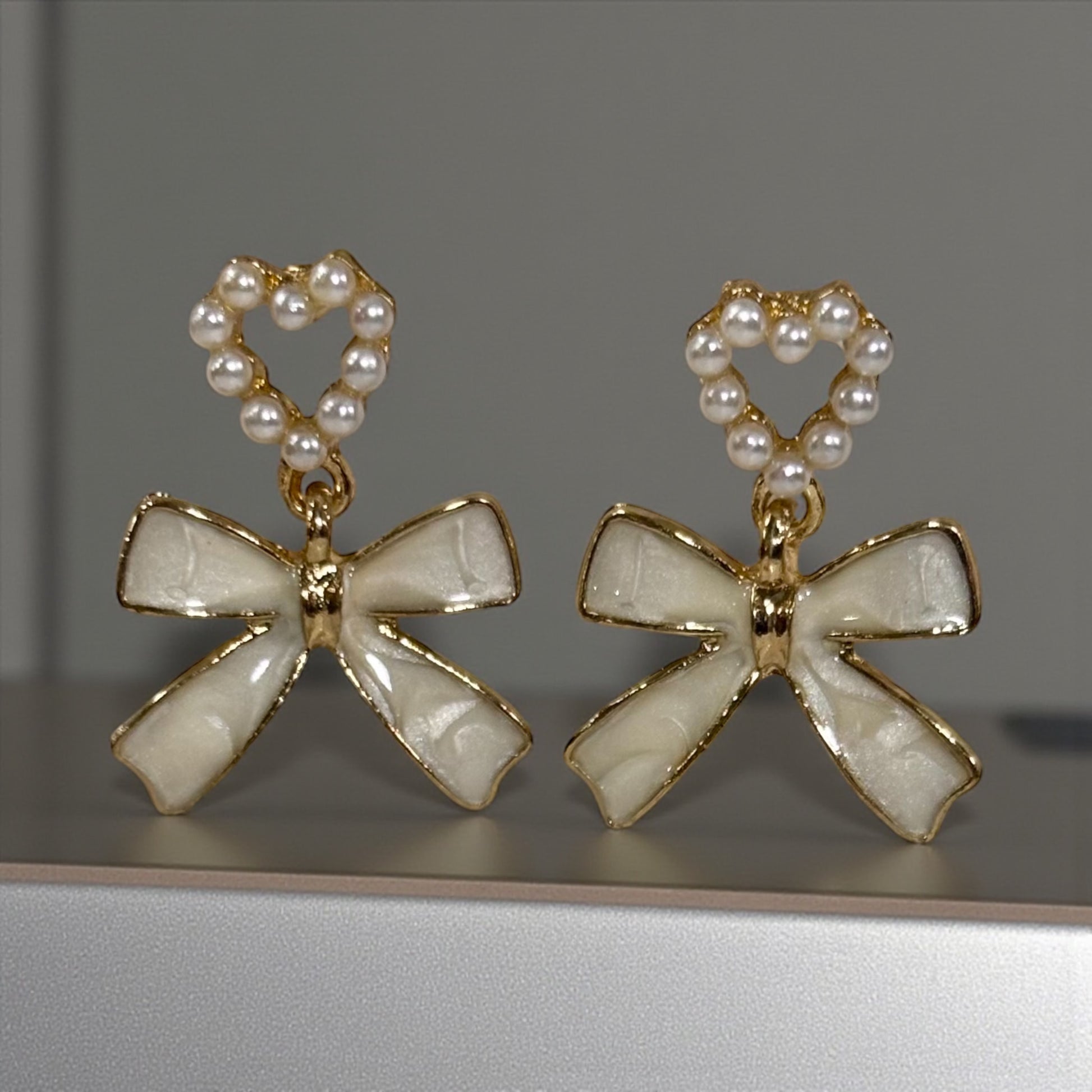 These delicate Pearl Heart and Bow Drop Earrings are a sweet and elegant accessory. The stud features a heart shape intricately crafted from small imitation pearls in a gold-tone setting. A beautifully glossy, off-white enamel bow with a matching gold-tone outline dangles below. The combination of the classic pearl heart and the dainty bow creates a romantic and timeless look, perfect for adding a feminine touch to any outfit.