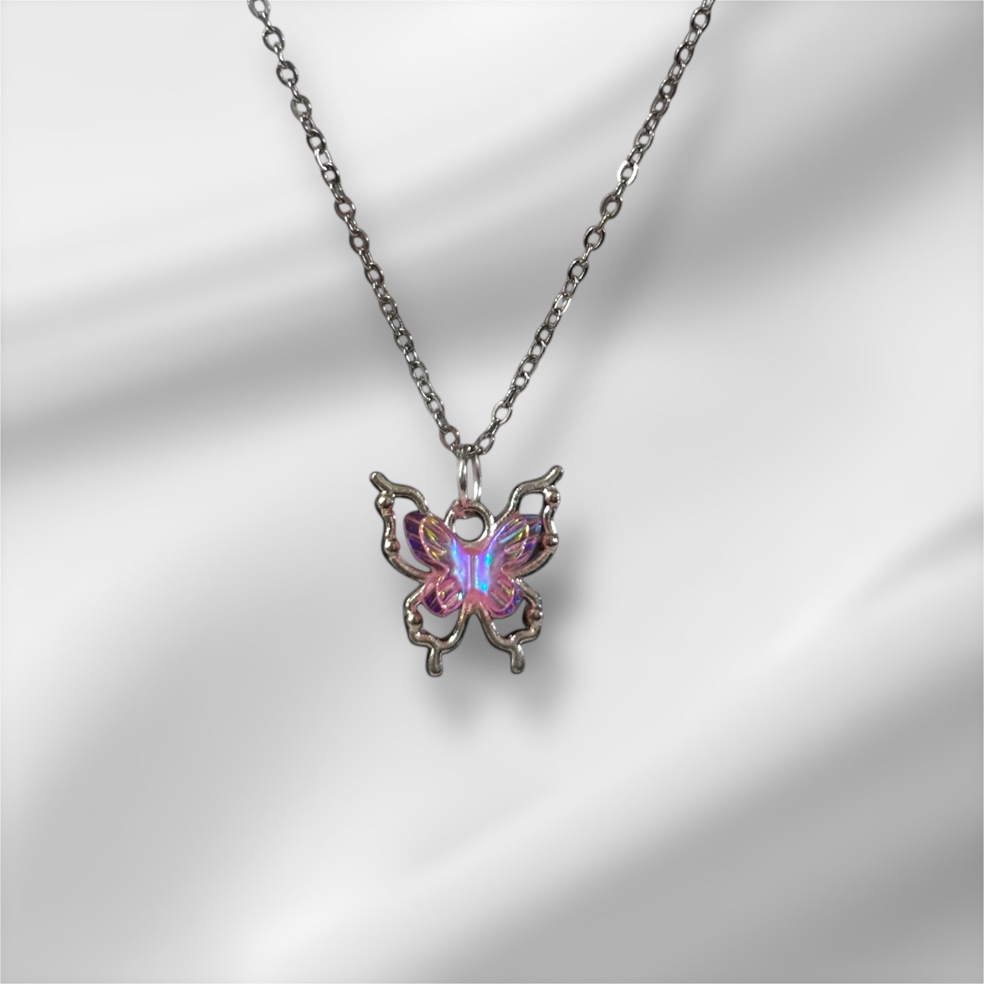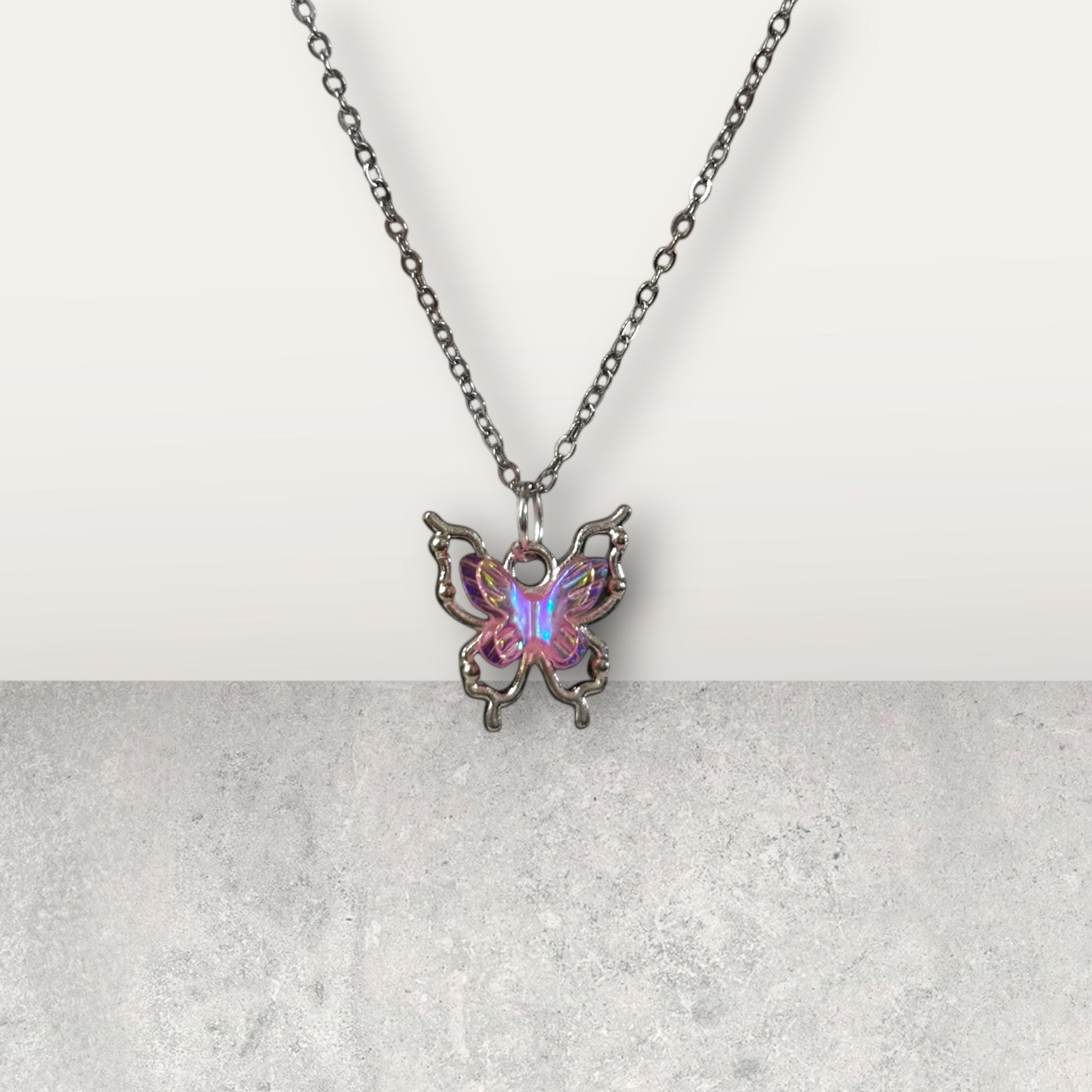 Pink Holographic Butterfly Pendant Necklace