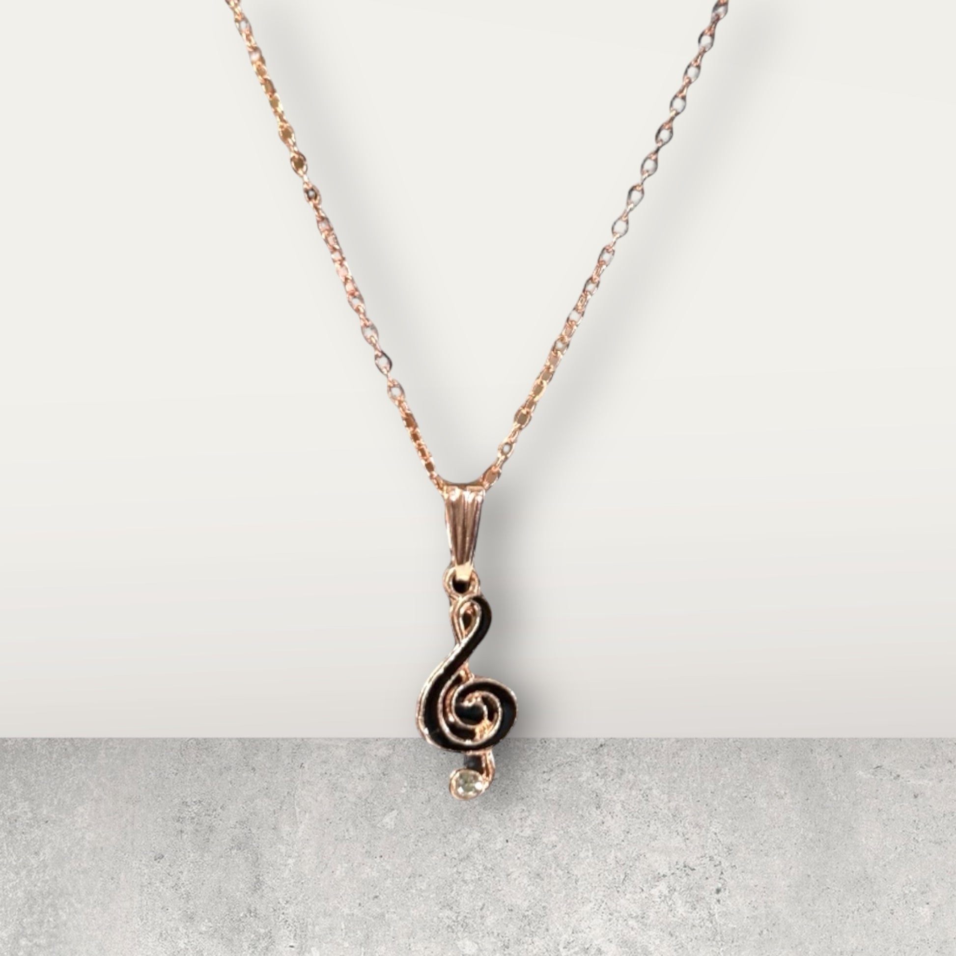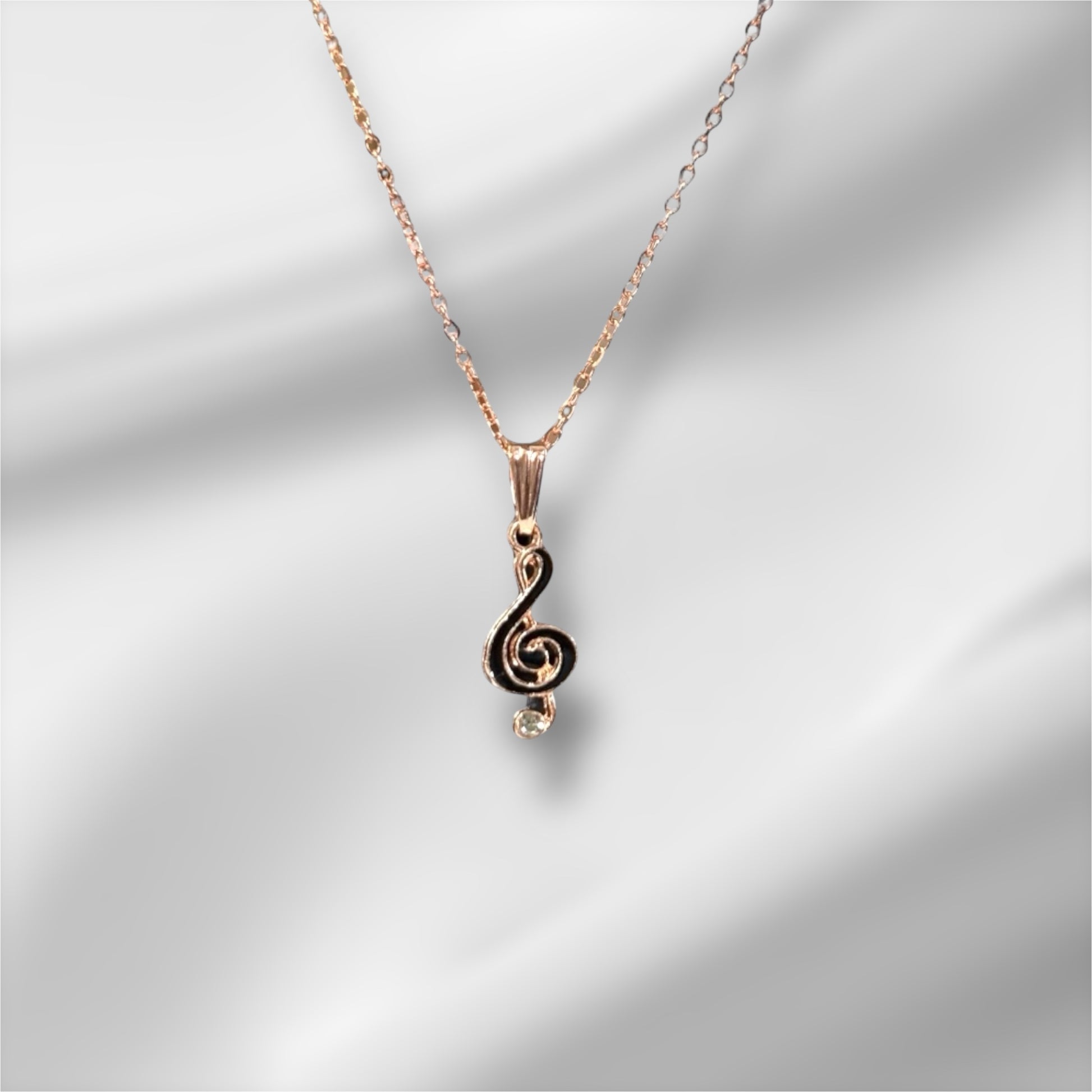 A delicate rose gold plated necklace featuring a classic Treble Clef (G-key) pendant. Finished with a tiny, sparkling dazzling stone. Perfect for music enthusiasts or a subtle, elegant touch to any outfit.