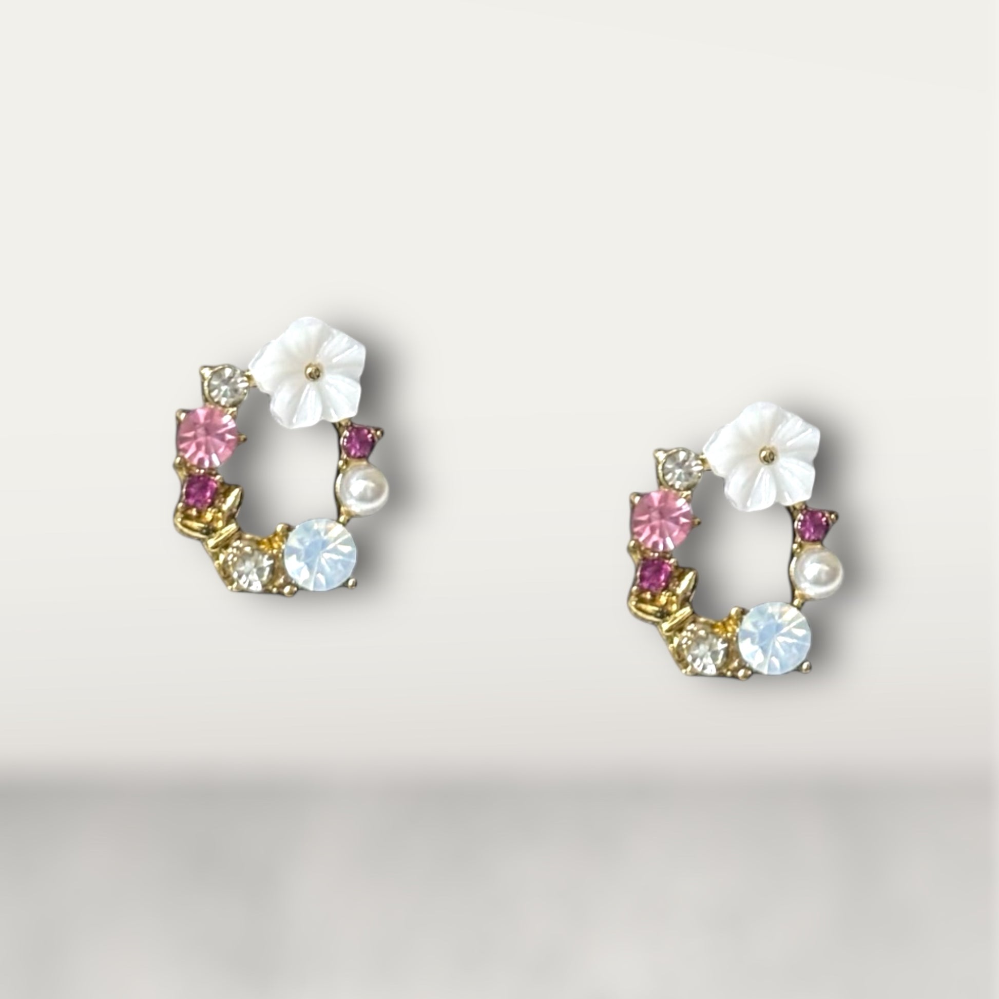 These enchanting Wreath Stud Earrings feature a lovely cluster of elements, including a white shell-like flower, sparkling pink and clear crystals, and a small faux pearl. Set in a warm gold-tone, they bring a whimsical touch of spring and add a delicate, feminine sparkle to your ears.